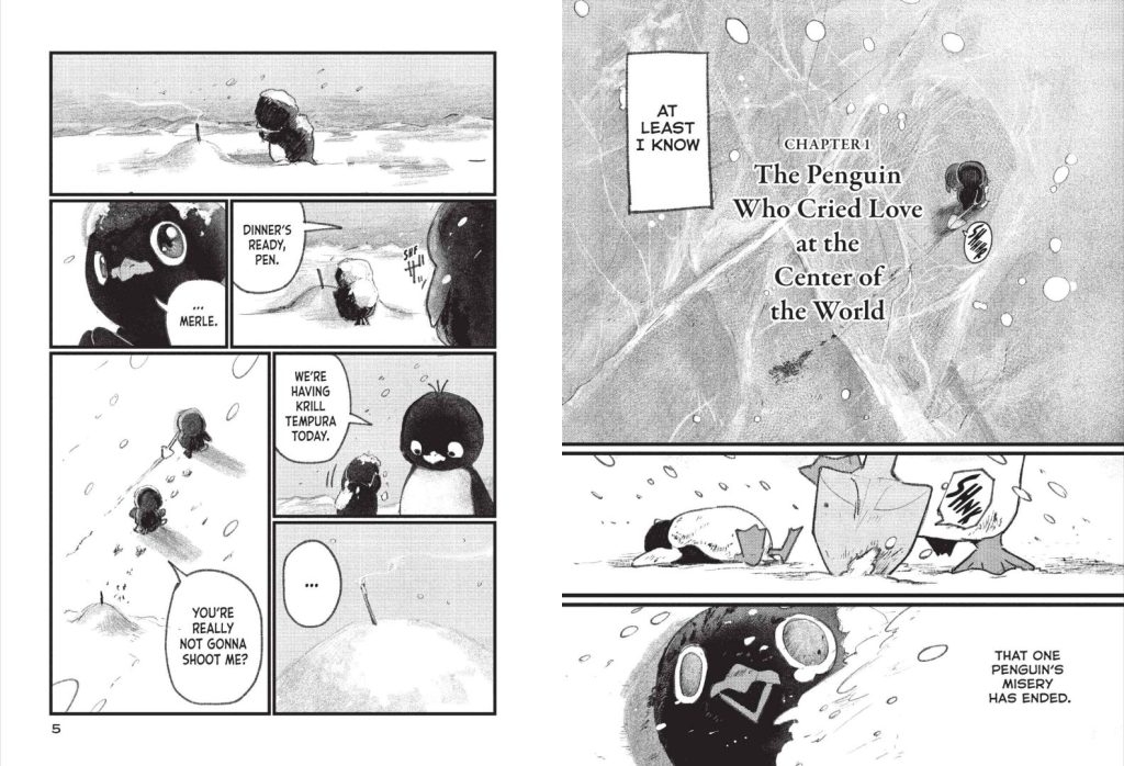 Kanato Abiko does a good job in this manga, with very distinct animal expressions, detailed backgrounds and framing in each panel. My only criticism is that in sometimes I found it hard to figure out who was talking in each panel, for example the penguin opening chapter – the two main characters look almost exactly alike, but I struggled to figure out who was killing whom in the last pages (kinda important to know!) Whereas in other chapters, such as Chapter 3, there’s a clear distinction between the old and young otter, so it’s easily to follow who’s who in that case.