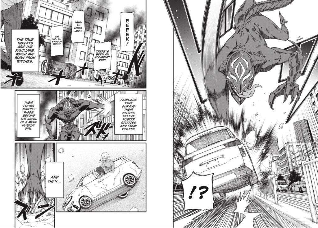 The art is Nemumi Haiba, who’s been an artist since the last 2010s, with this being their first published work in English. The style is good, with lots of cool details with the Magical Girls outfits, the creepy nature of the familiars, and the vast city that’s put in danger every week. Admittedly they didn’t make the best impression on me via the cover, as the Midlifer’s right hand is way bigger than his left.