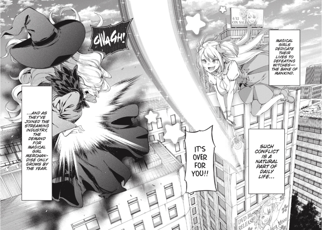 In a world where magical girls are full-on celebrities with streaming deals and more, they spend their days defeating witches whilst looking as cute as possible. But witches have familiars; they linger after a witch’s death, and are sometimes even stronger than a magical girl, so who deals with them? Enter Magical Midlifer, a middle-aged man with magical girl abilities but ten times stronger. Midlifers don’t perform for the camera however, they just clean up the mess magical girls and witches leave behind. This manga follows one such man named Tanaka.