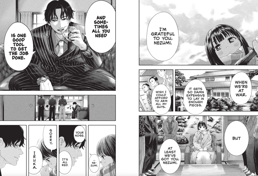 This is a romance series mixed with the dark underbelly of a yakuza story. As a child, Nezumi was held captive by the yakuza and eventually ended up murdering one of them. She’s proven her value as a killer and the current head of the family swears her sins have been forgiven, but there’s an underlying sense that they’re looking for an excuse to get rid of her. Perhaps in the future, should Ao become useful, they’ll turn him against her? Or perhaps Nezumi and Ao will team up to take down the yakuza and free themselves of this life.