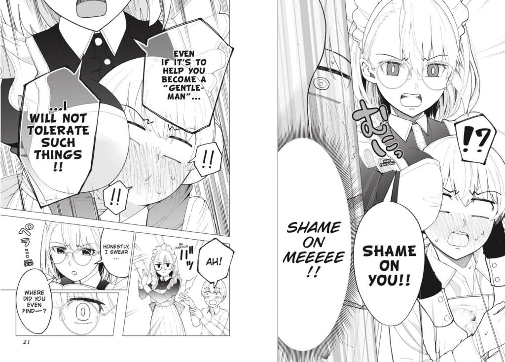 However, there are three major issues that ended up pulling me out of the story, rather than keeping me engaged. One is that inconsistent tone: a good three-quarters of this book are sexy comedy antics, with Alfred doing something to arouse Magley (such as accidentally getting a paper-cut and bleeding, or smelling good while washing his hands) and that’s where the story is at its best. But then the last quarter does a swerve in tone, having a dramatic, darker, more emotional tale of a vampire ready to die and eventually coming to accept her deep, loving feelings for Alfred. The vampire in the flashbacks (where we learn how Alfred met Magley) and the present-day vampire maid are meant to be the same person, but they feel like two separate characters as they act so differently from each other and the tone is so dissimilar, like they’re from two completely separate tales. It’s quite a whiplash going from a chapter where Alfred licks Magley’s feet, both being very horny as hell, to a backstory of a stoic, serious Magley dealing with her deep-rooted angst, and whether she truly belongs in his mansion. This will likely divide readers, as some will just want the sexy vampire fun time, and may find the sudden mood shifts annoying, or the ones who like the vampire story, and would rather stick with that than read more repetitive fan-service chapters.
