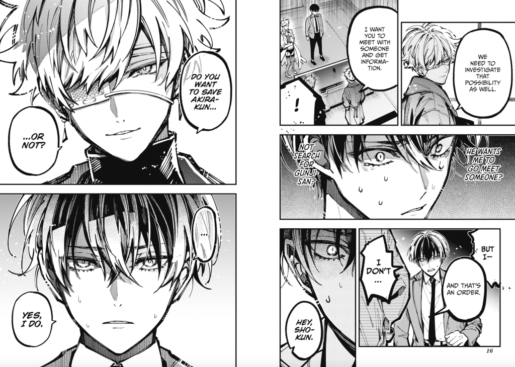 Now it’s a race against time, but figuring out where Akira is before he can be sold off is easier said than done. Sho is eager to get out there and do whatever it takes to get his partner back, having sworn to protect him. However, Amamiya tells Sho to calm down and sends him to meet informants Yuen and Meimei (whom we saw Akira meet in Volume 4), who will hopefully be able to point the AMO in the direction of the auction.