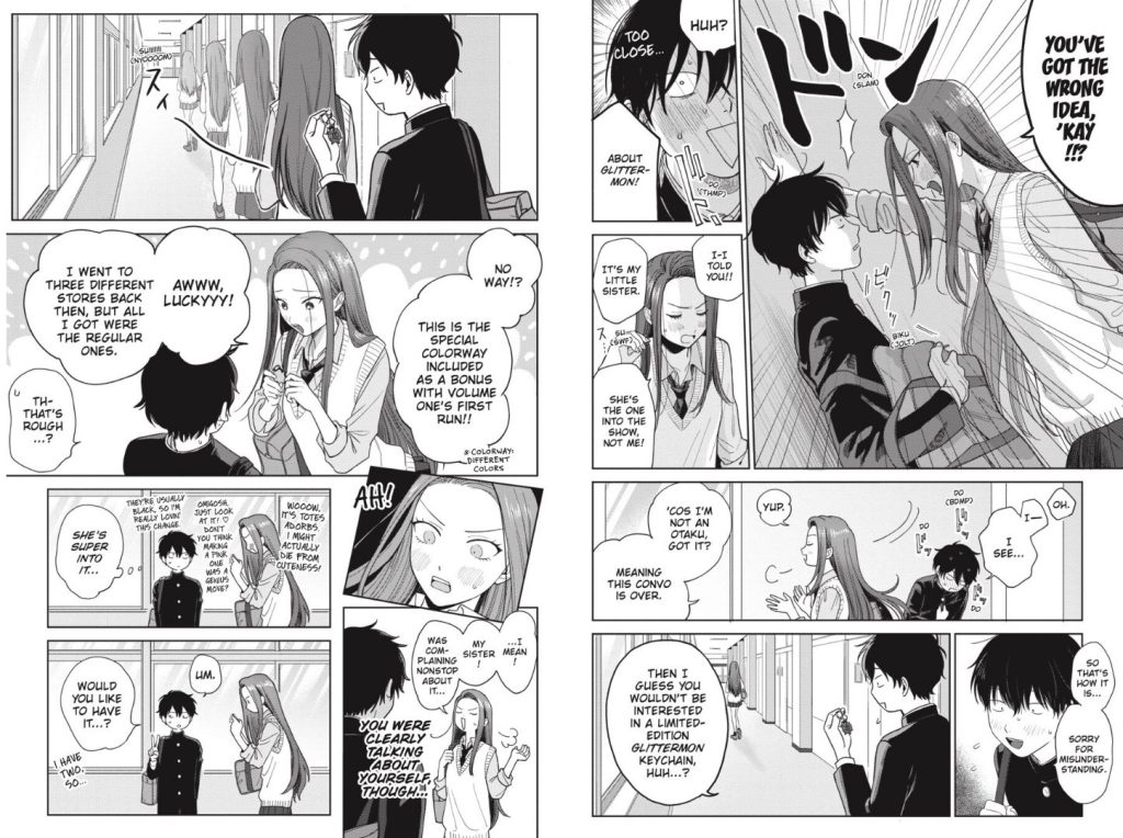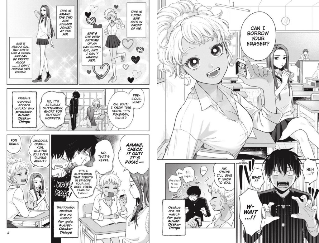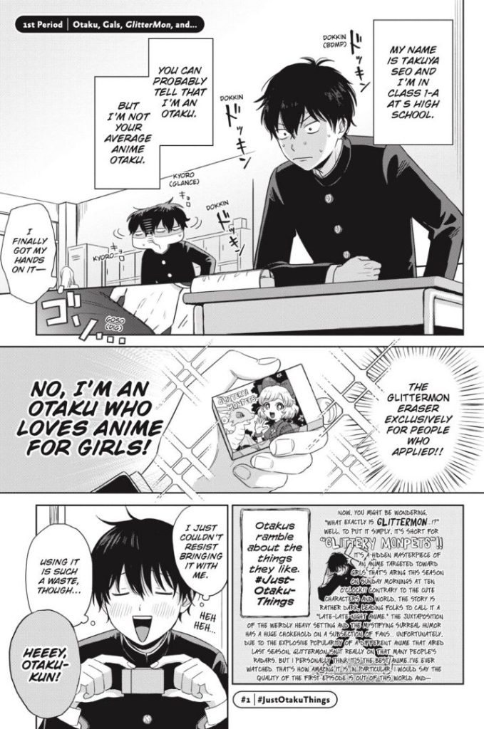 Our story follows Takuya Seo, a high school student who firmly believes that gals and otaku can’t be friends. He’s a big fan of the monster series Glittermon (this is similar to Pokémon), but he tries to keep his interest hidden so as not to be mocked by the two popular gals in his class: Ijichi and Amane. One day, Ijichi (who sits in front of him) forgets her eraser and asks to borrow Takuya’s, which just so happens to be a piece of Glittermon merch. Now his secret is out, but Ijichi seems surprisingly unbothered and as for her friend Amane… Well, she seems to know a surprising amount about the series for someone who isn’t an otaku.