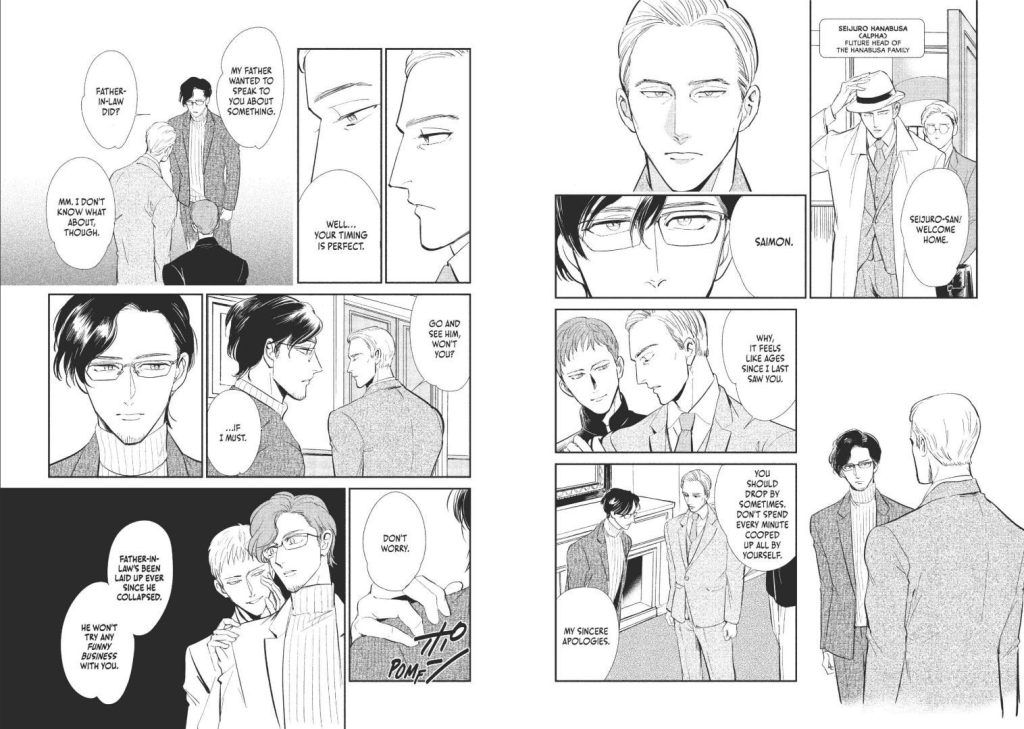 This is not the romantic depiction of the omegaverse found in other BL manga (like Never Let Go by Saki Sakimoto or Megumi & Tsumugi by Mitsuru Si) in which soulmates are attracted to each other by pheromones and bond for life when the alpha bites the omega on the back of the neck. In this omegaverse, these practices are described as ‘barbaric’ and ‘old superstitions’ – omegas are still regarded as useful for breeding/producing heirs but lacking in other respects. Poor Saimon still loves Seijuro and describes him as his soulmate but Seijuro seems to have learned from his manipulative father how to distance himself from anything as inconvenient as feelings if it goes against the family’s interests. When family head Zenjiro confides in Saimon about his illegitimate child, we learn that he’s taken full advantage of his position as family head and slept with all the omegas in the family. And his callous attitude to the young girl ‘given’ to him speaks volumes. Interesting, therefore, that the Hanabusa’s head butler, Teruhiko Shiba, is a beta (I wonder where this will lead?)