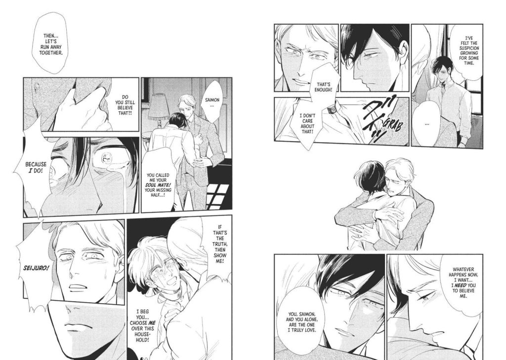 Saimon sets out to find the child – and it turns out that he’s a good-looking teenaged boy called Mamiya, street-smart because, his underage mother having died, he’s had to fend for himself. But… he’s also an omega who hasn’t yet gone into heat. Saimon’s plan is to introduce him to the family, pretending he’s an alpha. And if Mamiya goes into heat? Saimon once worked on developing a heat suppressant, although it was never government approved as in this omegaverse, omegas don’t take suppressants. Mamiya agrees, without hesitating; he’s more than ready to play the role. The two go to the main house and there’s an emotional meeting between father Zenjiro and his long-lost son. As for the rest of the family? They’re horrified. Saimon is now ‘mother’ to the new heir and the two alpha children of Seijuro have been supplanted by the newcomer. As long as Mamiya can keep up the illusion (and he’s a gifted actor) all should go according to Saimon’s plan… just as long as he doesn’t go into heat!