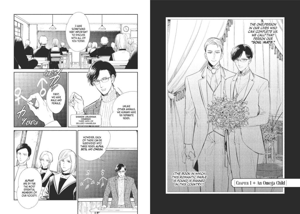 The translation for Kodansha is by Kevin Steinbach and makes for a fluid read, dealing expertly with all the omegaverse terminology; all this is brought to life on the page by Madeleine Jose’s lettering. There are also two pages of helpful translation notes. The cover image can be found in full colour at the start of the volume, purple roses removed to reveal an impressive family portrait. There’s a one-page afterword comic by the mangaka, explaining how the manga came to be commissioned, that it’s not a BL but a shojo and wondering if it’s SF or fantasy. The final page is a preview of Volume 2 (out in January in the US, but unless you’re reading the digital version, it’s probably February in the UK). This seems to be the first publication of a manga by Maki Marukido in English, although several of her manga are available in digital versions.