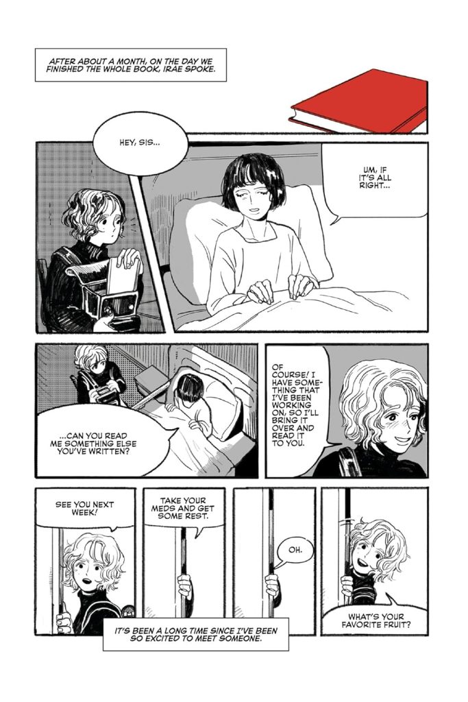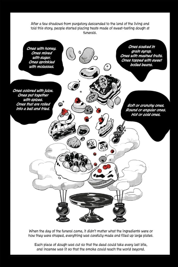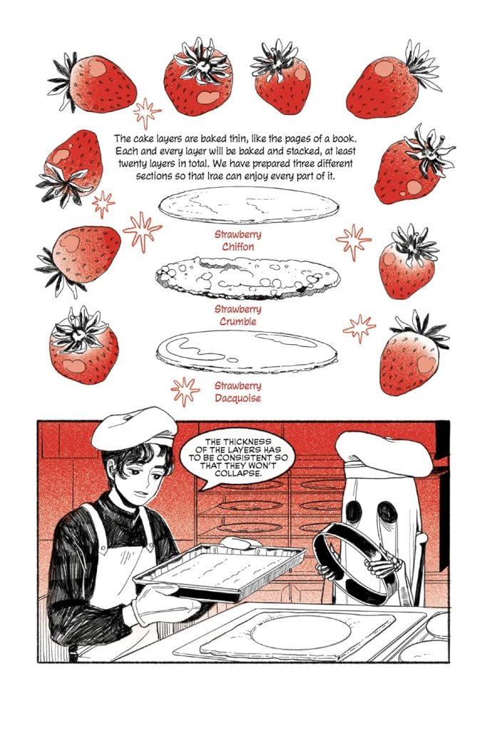 Sanho illustrates this book themselves, and it’s a very unique and stunning art style. The main colours are black and white (as most comics are) but also red. A very striking colour but it works wonders in this book; it brings out the vibrant strawberries and food colourings of the cakes, serves as a sunny backdrop to the meetings Mago has with her customers, and also brings out the supernatural crow gods we see at the beginning in a vivid way, showcasing their powers and influence over the dead. Red isn’t used on every page, but when it is, it’s for a particular purpose, to highlight what’s on the page or made the characters pop out more in a particular panel.