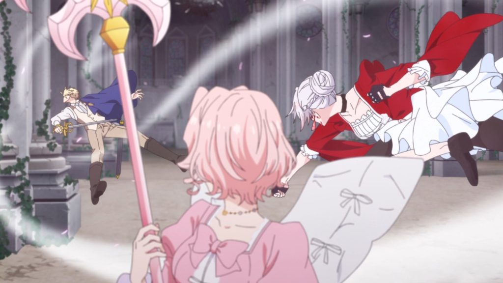 The other issue I have with this series is that although it looks good (even if the animation suffers a little later on) the storytelling is horribly unbalanced. Scarlet is pitted against pink-haired Terenezza (the Alice-themed ED is all about her) who represents a rival goddess and turns out to be the one isekai’d from contemporary Japan. Terenezza believes she is the heroine of the story and must therefore destroy the villainess, Scarlet. This is a fun premise (in isekai terms) but the anime introduces it in a haphazard way (and mostly at the very end) when – if it could have given us both sides’ viewpoints much earlier, it could have been a much more interesting story. We’d be asking ‘Perhaps Scarlet is in the wrong? Who’s the real villainess here?’ There are also some muddled revelations as to who the real Saint Diana is and why (all told backwards again). So, I’m disappointed by the way this anime frittered away its dramatic resources by making it all about Scarlet punching people. (Yes, we might feel frustrated enough to want to punch other people at times but resorting to brute violence is never the answer, children!!)