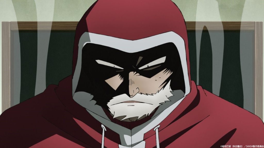SANDA turned out to be one of the most compelling (although also disturbing) watches, helped by Science Saru’s striking animation and mangaka Paru Itagaki’s controversial subject matter set in 2080s Japan. When missing student Ichie Ono reappears, it turns out she’s undergone puberty and is now an adult. Her best friend (and crush) Fuyumiya is distraught and confused – and the hideous headmaster Oshibu (who’s had so much plastic surgery to keep looking young at 92 that he’s covered in concealed scars except for his hands which betray his real age) says she must leave. The children (in scarce supply in this future Japan) are kept from puberty in his school by never being allowed to sleep all the way through the night. The underlying theme is – in the anime, at least – the preservation of youth and youthful appearances at all costs. Fourteen-year-old Sanda – who turns into adult and buff old man Santa Claus whenever he wears red – has to grant children’s wishes, no matter what they might be. And so he finds himself in some impossible situations, oscillating between his ‘child’ self and his ‘old man’ alter ego – ultimately taking on Oshibu in a thrilling duel (which brings out the best from the Science Saru animation team).