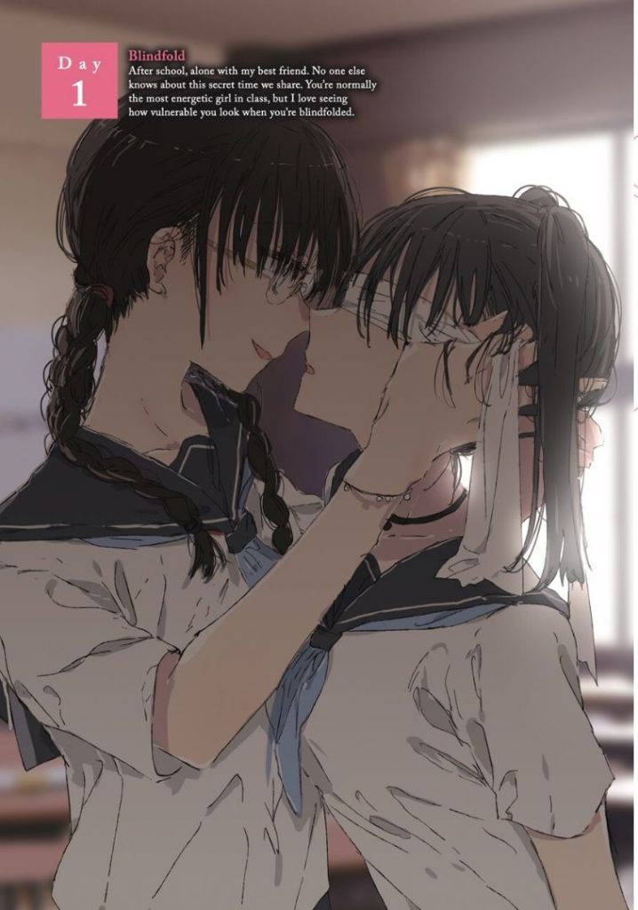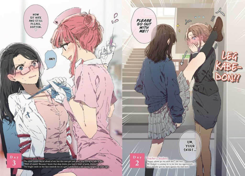 The same can be said for the pairings and even the faces; it seems that Muromaki has only a handful of faces and hairstyles up their sleeves, so a few days look like they feature the same cast over and over, rather than different girls falling in love across the book. This isn’t helped that we have multiples of the same set-up, such as four Honour Students x Trendy Girl scenarios and multiple cousin days too, just named differently. I think this idea/book would have benefitted from multiple mangaka pitching together, so that not only would it have allowed for different art styles to prevent the copy and paste of the same face designs, but also allowed for unique ideas, or at least unique interpretations of the same idea, as one mangaka’s concept of a student x teacher relationship won’t be the same as another’s. I’m not saying that Muromaki isn’t talented, but that the book gets repetitive fast, and might have benefitted from more cooks in the kitchen this time round.