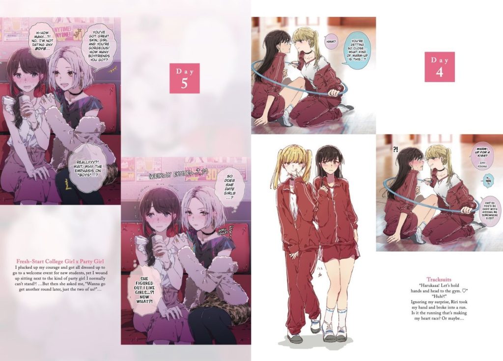 As in the title, in total there are 100 days of yuri, but they’re broken up into sections (‘one-sided love’ and ‘everyday life’ for example) with a small panel opening and ending each section, and there’s even a mini manga that opens the book, so you’ll get more than just 100 days’ worth. Each day is also a variety of content; sometimes you’ll get a single-page spread, or at times the author fits in multiple panels to tell a mini story. Regardless, each day has a title and some text to set the scene of each day, which is nice to see.
