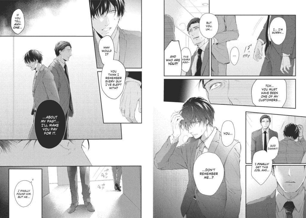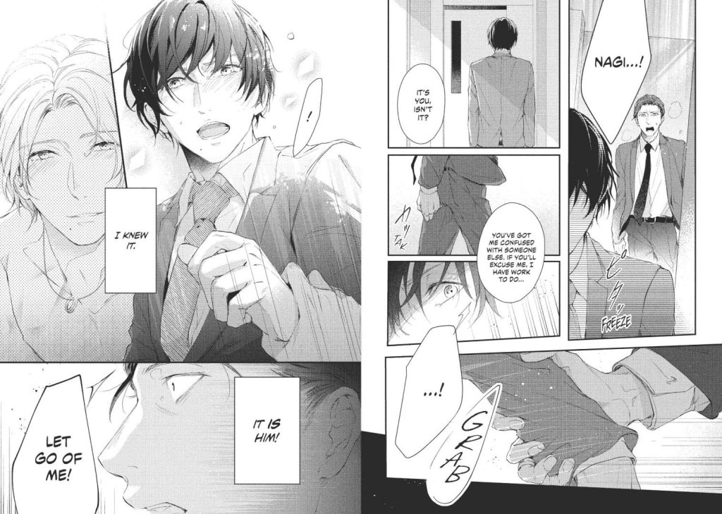Kanzaki, a businessman, has just returned to Japan after spending five years working in Malaysia. Before he left, he was briefly in a passionate relationship with a young male sex worker called Nagi – but he’s never been able to forget him. He even still wears a ring Nagi gave him. Back at the main office, he meets a new member of his team called Nagisa Futagami and realizes that he’s one and the same as his old love, even if his hair is no longer blond. But when they’re alone and Kanzaki reaches out, Futagami reacts angrily and defensively, saying, “If you tell anyone… about my past… I’ll make you pay for it!” Devastated by this rejection, Kanzaki finds himself realizing: It’s like I’ve been left alone in the past…all by myself.