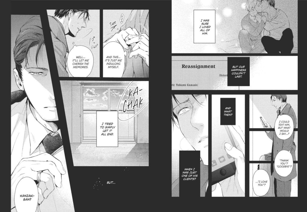 Kanzaki is not one to give up so easily – and manages to encourage Futagami to talk a little about what led him to give up sex work and become a salaryman. He even gives him back his ring. But their conversation is interrupted when Futagami gets a personal call; it’s Aoi, the man he’s living with, who’s come to collect him. Kanzaki realizes that Futagami has moved on and shakes his hand, telling him, “I’ll continue to support you as your boss.”
