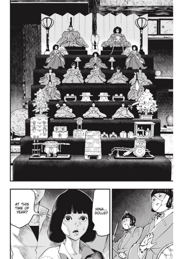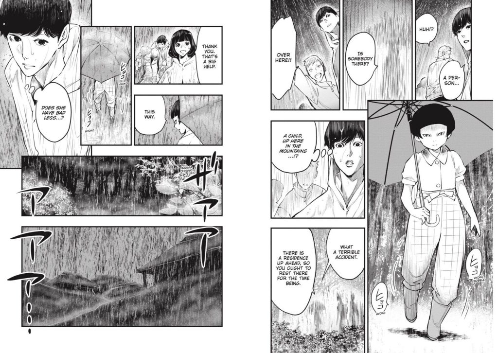 The manga starts off with one-shot stories of people attempting to climb the mountain and vanishing: a group of college students, a reporter for a supernatural magazine, a woman researching local folktales, etc. The series is strongest in the early stages when the danger is at its most mysterious: the people who stumble into the the village just have little glimpses into the monstrosities going on before either being killed or going mad from the experience. The students are introduced via the ‘maid’ to a mansion run by an eerie woman named Touko Kamiya, and it’s mere minutes later that the members of their group are killed one by one. Another chapter has a girl who stumbles into the village by accident and gets to see more of the mansion but ends up meeting one of the more gruesome fates in the manga.