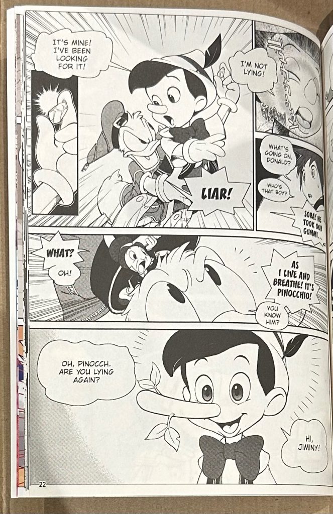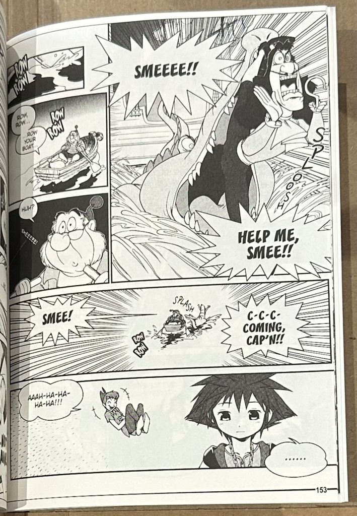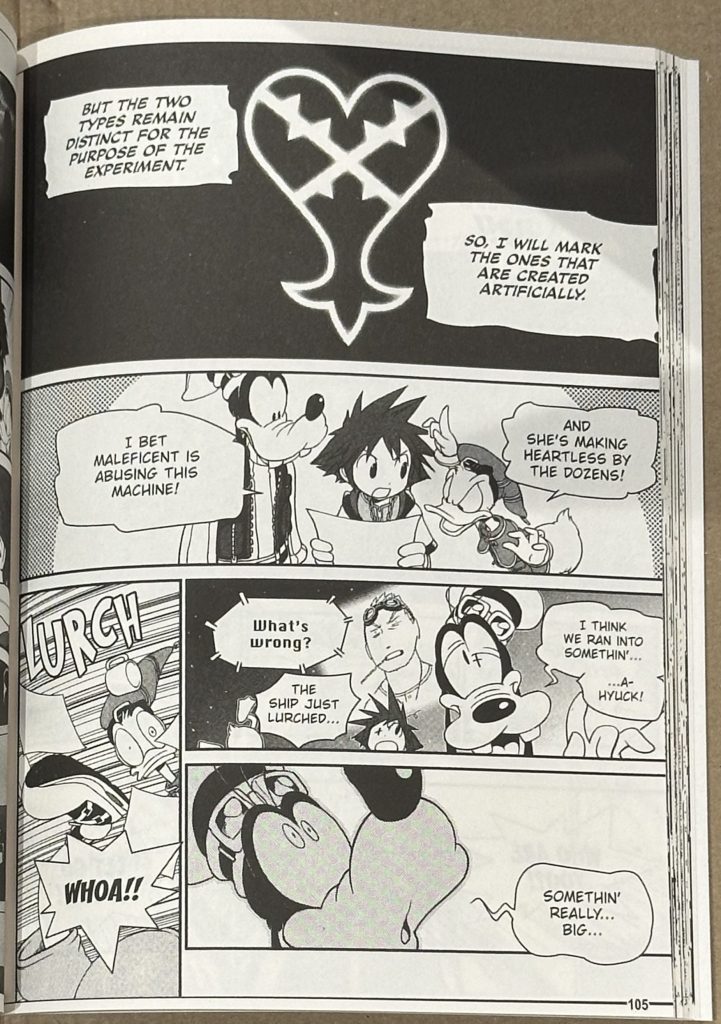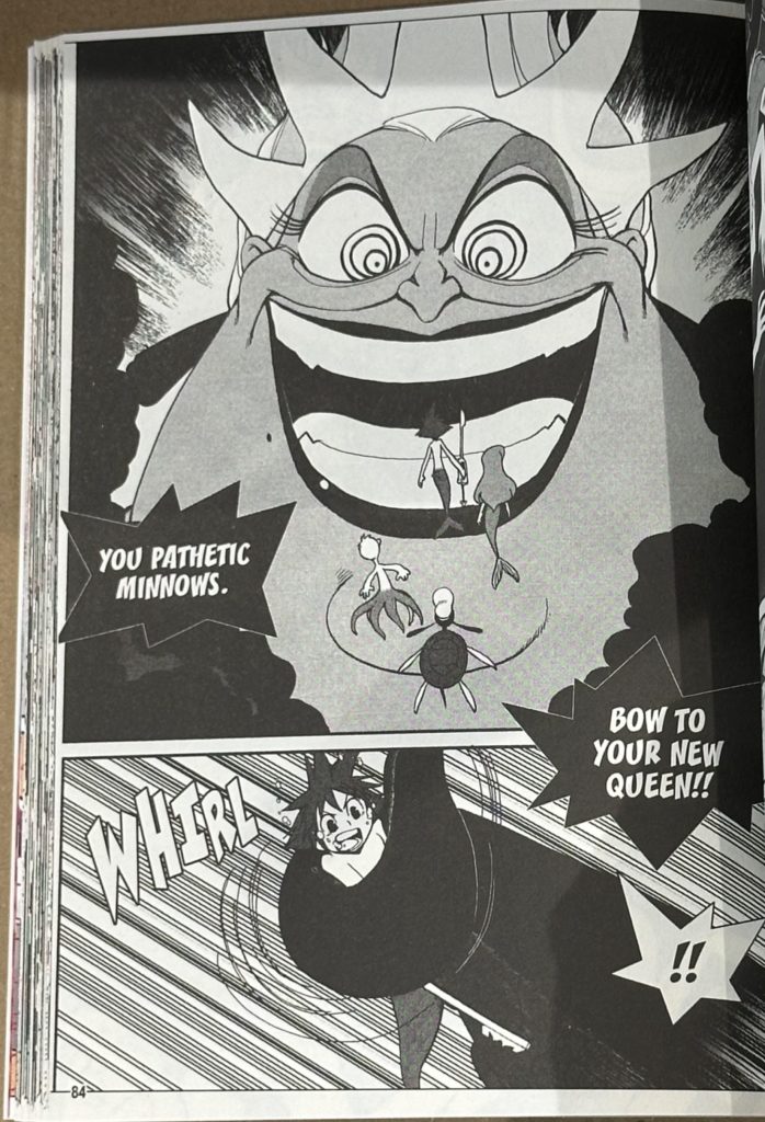 From here we get a truncated version of The Little Mermaid of sorts, with Princess Ariel coming under attack from the Heartless, and her overprotective father King Triton forbidding her from venturing out again, mistrusting our heroes and destroying her collection of objects from the surface – the subject of her desires to venture to land. Not only that but Ariel’s desires become the target for manipulating by the cunning Great Witch of the Sea, Ursula, stealing King Triton’s Trident to try and make her dreams come true. Much like the game, our heroes take chase and Ursula becomes a monstrous Kraken-like being, though soon gets vanquished (with less button-mashing in this adaptation!) with Ariel and her father reconciling their differences, and another Keyhole is then sealed to bring peace to Atlantica. Whilst it might seem like a small summary, the manga continues at pace, and as I recall this was a relatively short world in the game as well.