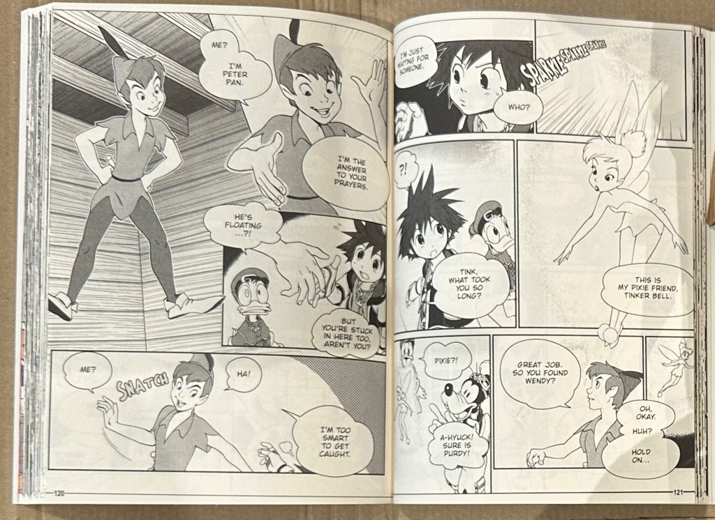 The following chapter slows down the action in favour of the trio and us as readers being imparted with more information on Ansem the Wise, whose notes have been gradually assembled throughout the journey. We learn that he discovered the Heartless one day and opted to study their existence, inventing a machine which could create Artificial Heartless beings in the process. This method, of creating a heart from nothing is tethered to Maleficent’s actions so far, exploiting the device to kidnap princesses from faraway worlds and take them to Hollow Bastion where Maleficent resides. Naturally, just as details are getting juicy, the Gummi Ship is rammed by a large pirate ship, where Riku and Sora are once again reunited, but this time Riku has allied himself with the foppish yet threatening Captain Hook within the Disney imagining of Neverland.